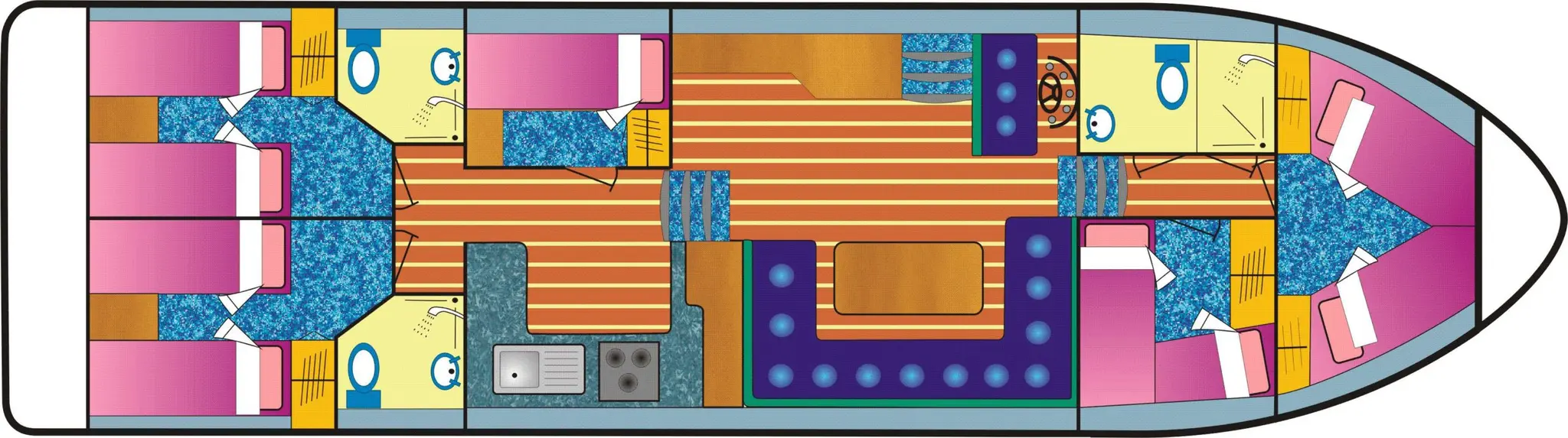 Das erstklassige Flaggschiff der Flotte verfügt über 5 komfortable Kabinen mit Einzel- oder Doppelbetten, wovon 1 Kabine mit Kajütenbetten. 2 kombinierte WC/Dusche und je eine separate Toilette und Dusche. Geräumiger Salon mit Ausziehbett, DVD-Spieler, 240 V-Stromversorgung und Haartrockner. Grosszügig eingerichtete Küche mit 2 Kühlschränken und 2 Backöfen. 2 Steuerstände, einer im Salon und einer auf dem grossen und komfortablen Sonnendeck. Bug- und Heckstrahlruder.
