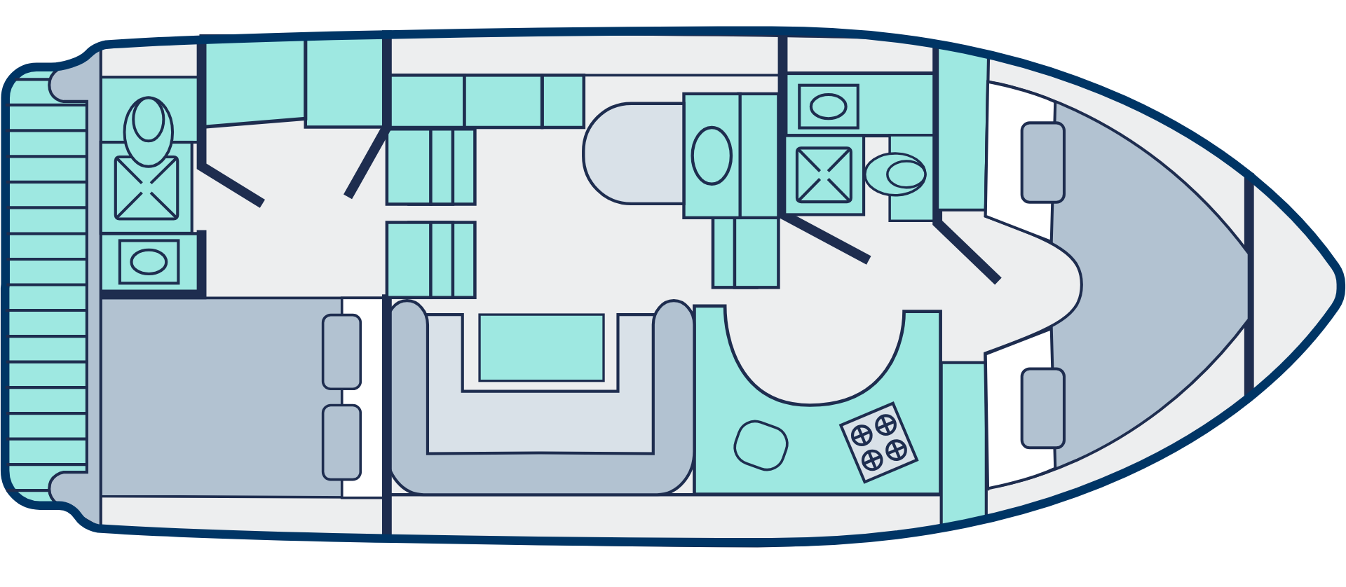 Gutes Boot mit 2 Kabinen; grosse Heckkabine mit Doppelbett, Bugkabine (wahlweise mit Doppelbett oder zwei Einzelbetten). 2 kombinierte Dusche/WC mit Waschbecken. Schöner, grosser und heller Salon (kann zum Doppelbett umgestaltet werden) mit Steuerstand. Grosse und moderne Küche. Zweiter Steuerstand auf dem Sonnendeck, wovon Stufen auf die Badeplattform führen. Das Boot verfügt über 220-Volt Anschluss, USB-Steckdose, Radio und CD-Spieler. Das Bugstrahlruder erleichtert das Steuern.