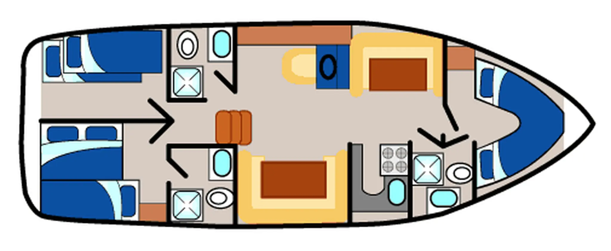 Komfortables Boot, schön mit Kirschholz eingerichtet. 3 Kabinen (2 wahlweise mit Einzel- oder Doppelbett, 3-er Kabine mit Doppelbett und Stockbett), jede mit Dusche/WC. Geräumiger Salon mit Ausziehbett, TV/DVD, Radio mit CD-Spieler, Safe und Küche. Steuerstand innen und zweiter Steuerstand mit Klappverdeck aussen. Das Bugstrahlruder macht die Handhabung leicht. Gutes Boot für Familien oder 2 bis 3 Paare.