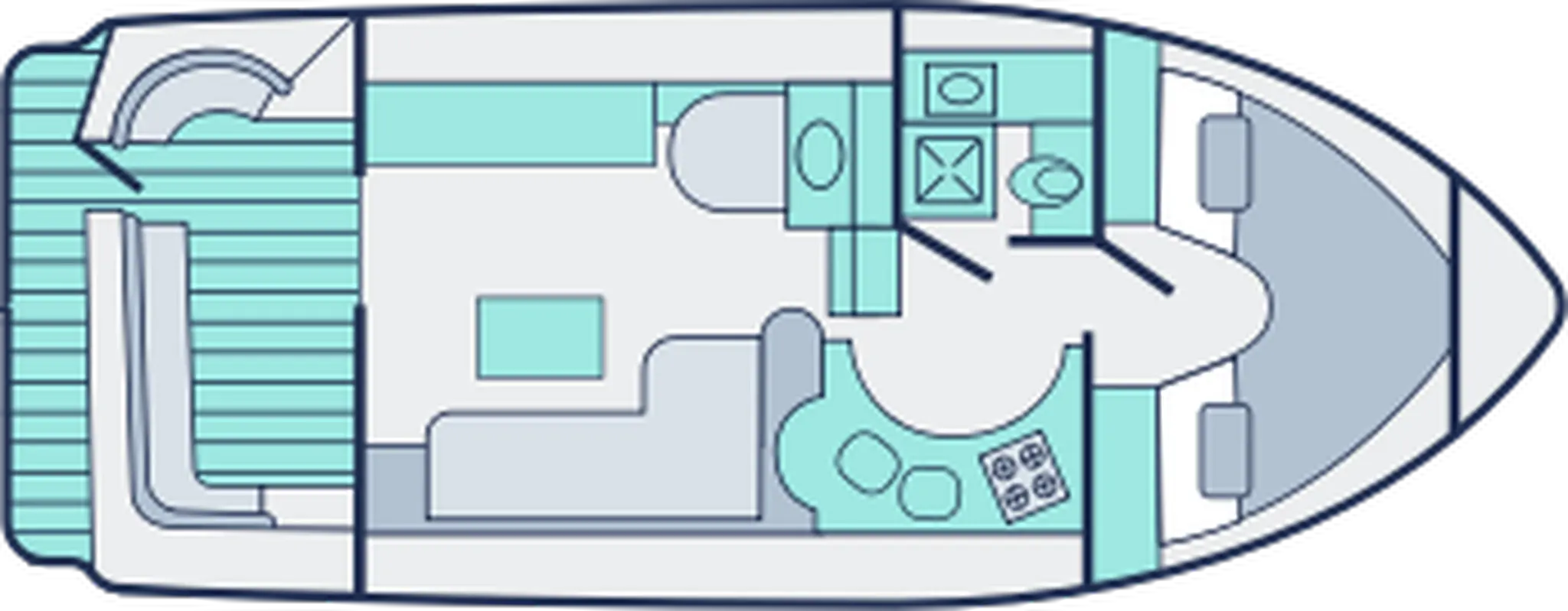 Kleineres, modernes und beliebtes Boot. 1 Kabine im Bug mit Doppelbett oder zwei Einzelbetten. 1 kombinierte Dusche/WC mit Waschbecken. Der helle Salon mit Sitzecke (kann als Doppelkoje benutzt werden) und gut eingerichtete Küche, ist durch eine Schiebetür ebenerdig mit dem schönen Sonnendeck verbunden. Kleine Badeplattform mit Einstiegsleiter. Steuerstand im Salon. Das Boot verfügt über Radio/CD-Spieler und 220 Volt Anschluss.