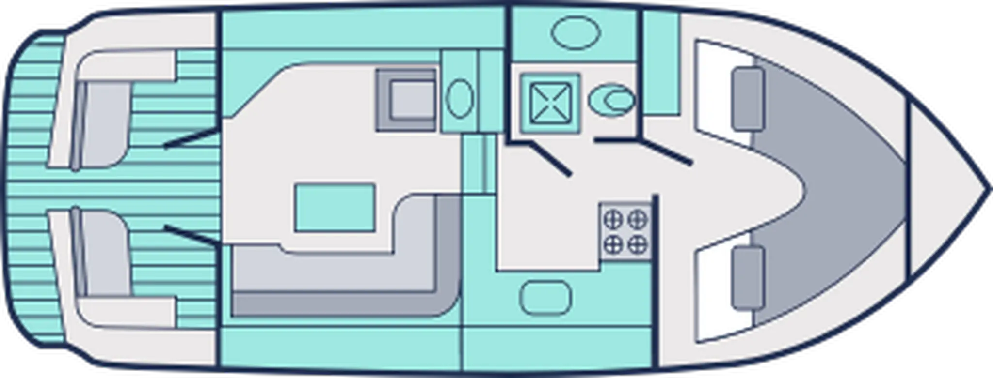 Schnittiges und komfortables Boot. Kabine im Bug mit zwei Einzelbetten, die in ein Doppelbett umgewandelt werden können. Kombinierte Dusche/WC mit Waschbecken. Grosser Salon (kann als Doppelkoje genutzt werden), 220-Volt Anschluss, USB-Steckdose, Radio und CD-Spieler, Steuerstand und ebenerdiger Ausgang zum Achterdeck mit Badeplattform. Komplett ausgerüstete Küche. Ideales Boot für Paare oder Fischer.
