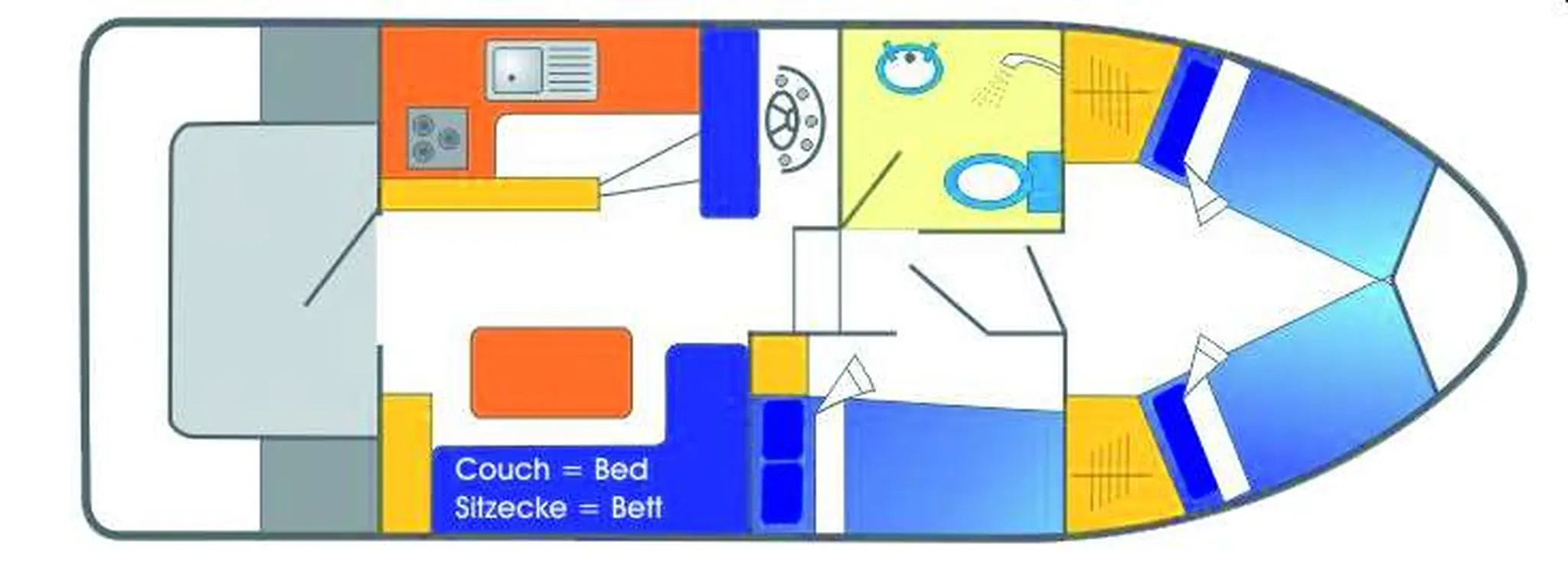 Schnittiges Boot, leicht in der Handhabung. 2 Kabinen, grosse Kabine im Bug – wahlweise mit Doppelbett oder zwei Einzelbetten, kleinere Seitenkabine mit Doppelbett. 1 Dusche/WC mit Waschbecken. Salon mit Sitzecke (kann zu einem Einzelbett umgewandelt werden), mit Steuerstand und kompletter Küche. Vom Wohnbereich direkter Zugang zum Sonnendeck mit Badeplattform. 240 Volt Stromversorgung. Dieser Bootstyp eignet sich für Familien und Fischer.