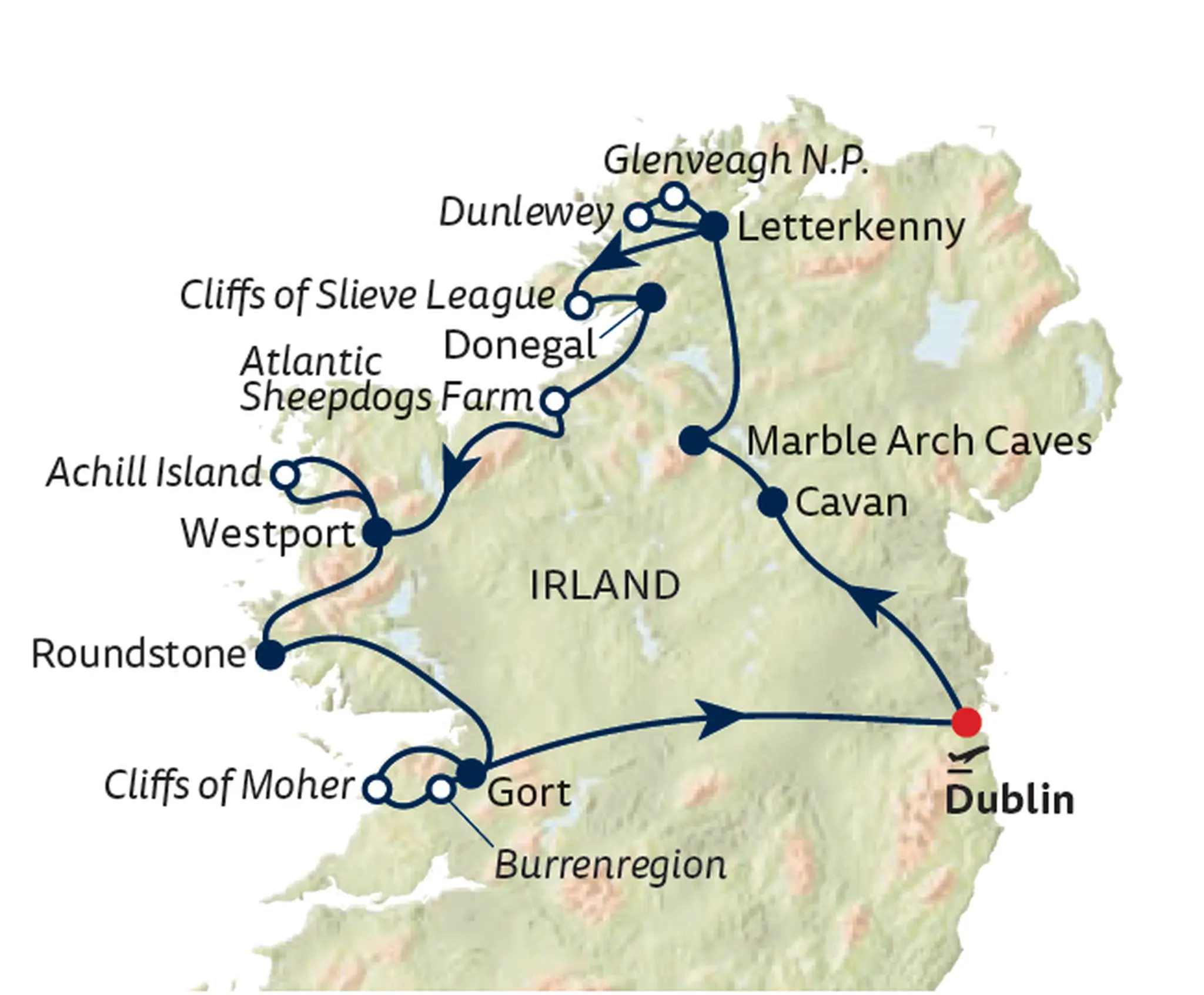 Zahlreiche Spaziergänge & Wanderungen spicken die Reise, die Sie zu majestätischen Klippen, weitläufigen Moorlandschaften, magischen Tropfsteinhöhlen und zu Irlands grösster Insel führt.