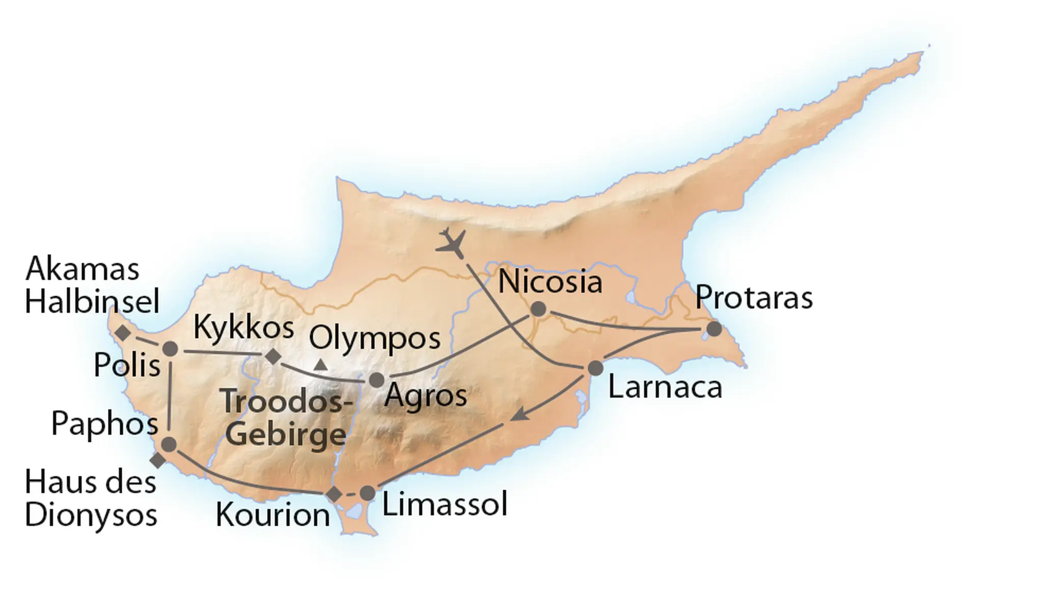 «Kopiaste – Willkommen auf Zypern». Diese Mietwagenrundreise bietet Ihnen die ideale Kombination aus kulturellen Schätzen, Naturschönheiten, Genuss und Erholung. Auf dem Programm stehen unter anderem die Akama Halbinsel oder das Troodos-Gebirge. Auch an Besuchen charmanter zypriotischer Dörfer wie Paphos oder Polis fehlt es nicht. Die Rundreise kann optimal mit Badeferien in Ayia Napa, Protaras, Limassol oder Paphos verlängert werden.